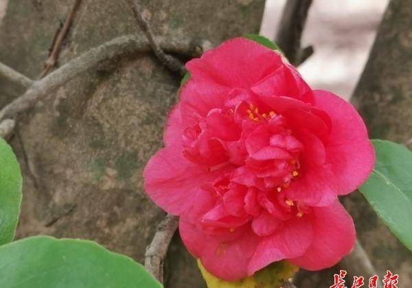 仲春时节,风和日丽,山花烂漫。记者驱车来到黄陂区木兰山风景区管理处所在地下马石,只见办公楼西侧陡峭的山坡上,建有一座木兰花苑。穿过花苑门洞,一棵开满红花的山茶古树映入眼帘。
