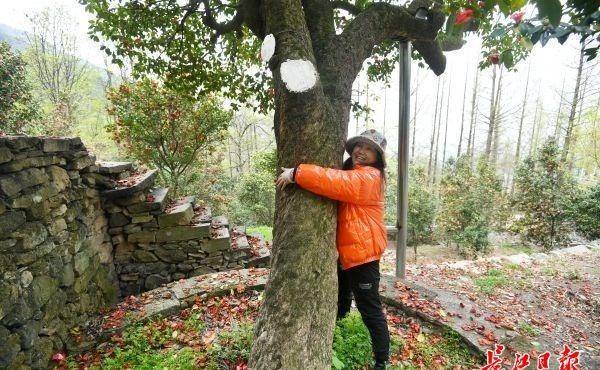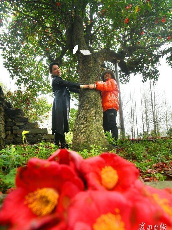 市民李英慕名前往木兰山风景区,探望了这棵古山茶树。由于一人无法环抱,她邀请游客丁女士一起,合抱了这棵古树。李英说,这棵山茶树经历500多年风雨,活到今天特别不容易,它简直就是茶树中的英雄。能够抱抱它,向它表达爱与敬意,自己感到很荣幸。