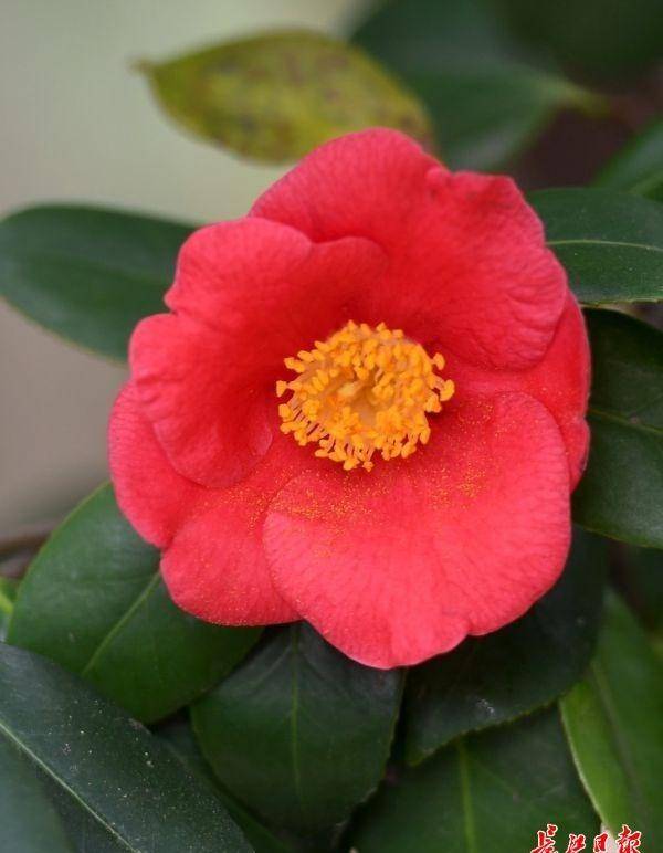 逐级而下,可以一直走到山茶古树跟前。山茶树立在一面1米多高的石墙边,被半圆形石砌树池包围,空间显得有些局促。站在墙顶步道上,可以“零距离”观赏盛开的山茶花。这棵古树开的山茶花为单瓣,颜色火红,花蕊金黄,煞是好看。