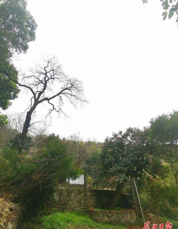 距离山茶古树约10米的东侧山坡上,还有一棵十几米高的110岁古树,尚未萌生新叶。当地人告诉记者,这是一棵老鸦杮,杮树的一种,年年开花结果。站在十几米外,可以拍到这两棵古树同框的镜头。