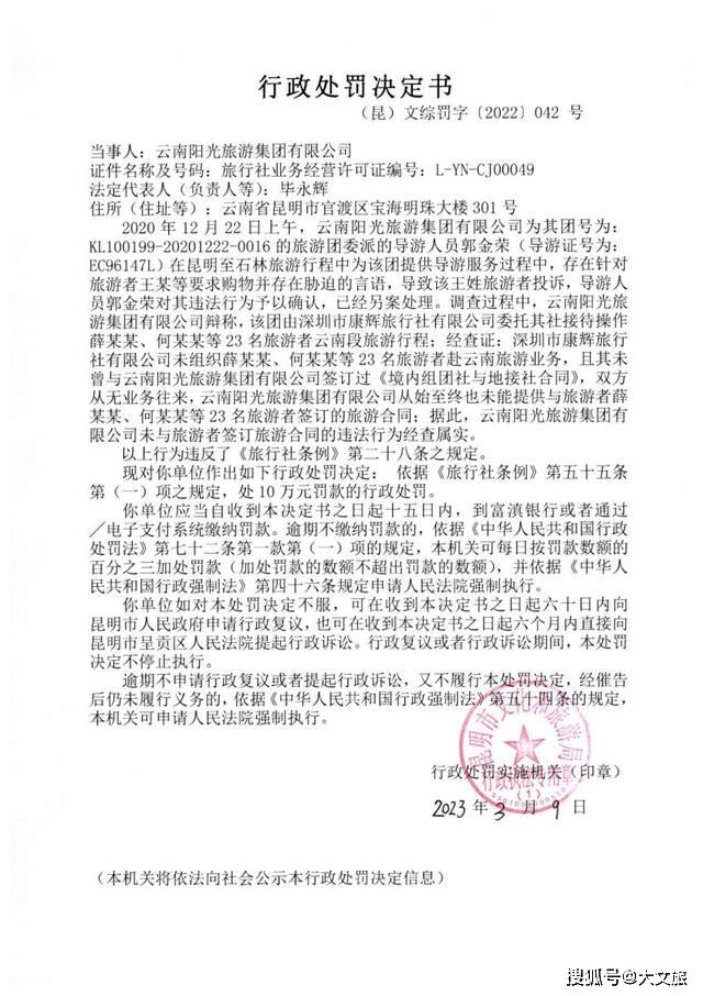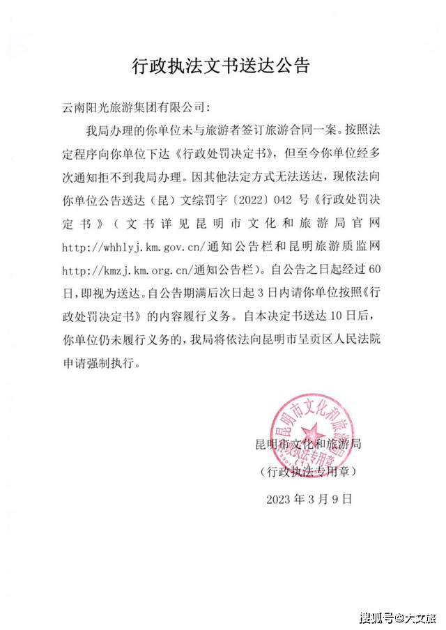昆明市文旅局《行政执法文书送达公告》显示:该局办理的云南阳光旅游集团有限公司未与旅游者签订旅游合同一案。