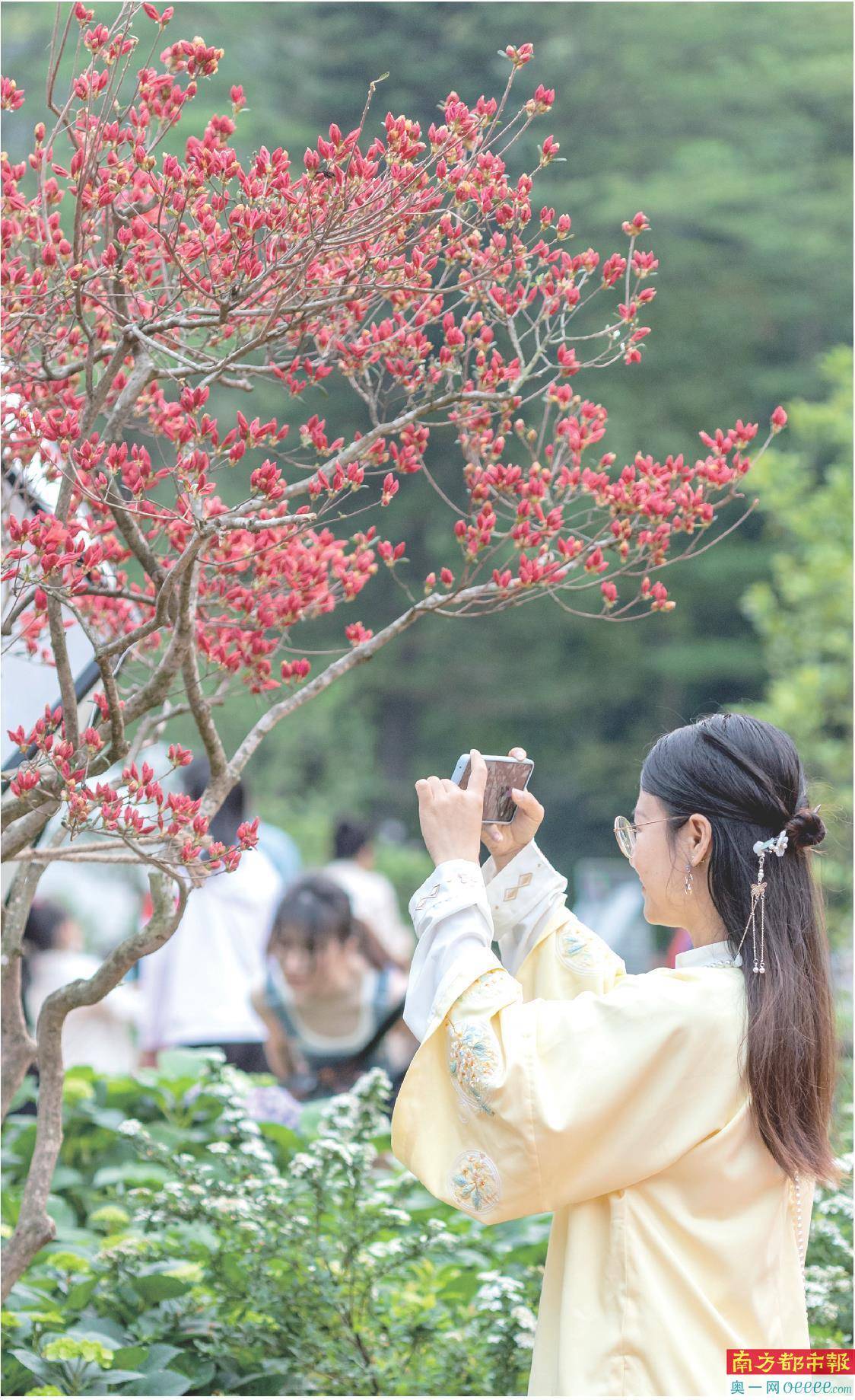 4月10日,游客在花展现场赏花拍照。