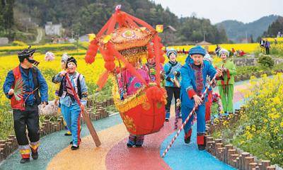 图为4月7日,湖北省恩施市盛家坝镇石栏村村民在油菜花田边为游客表演节目“彩莲船”。文 林摄(人民视觉)
