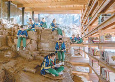 罗宇杰把书屋选址在了浙水村东的浙水河前。整座书屋依山而建,室内没有书桌、凳子,而是利用岩石本身的梯度,打磨之后成为阅览区。白天,阳光穿过玻璃,人们能够在阳光下尽情阅读;到了晚上,室内暖黄色的灯光亮起,又成了村内一道景观。