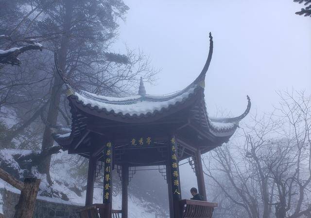峨眉山清淡的蒸汽如薄薄的白纱缭绕在身边,与厚厚的白雪相映衬,颇有仙境的感觉。