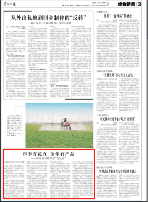 4月11日,《农民日报》刊发《四季有花卉 全年有产品——探访贵州毕节市“花经济”》,聚焦近年来,贵州省毕节市百里杜鹃管理区不断做优旅游,深入谋好“医疗康养、温泉民宿、林业花卉”三篇文章,按照“产业景观化、景观经济化”和“一花两叶多特”的发展布局,高位推动花卉产业发展,大力开发以盆景杜鹃为主的高山冷凉花卉,加快农旅融合,走出一条以农兴旅、农旅融合发展之路,为当地群众带来了实实在在的特色产业发展红利,助推乡村振兴。具体报道如下: