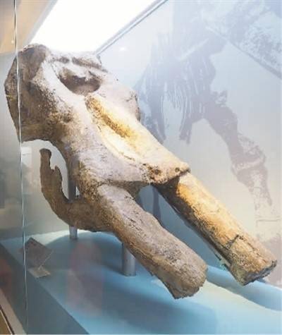 大的是黄河象。上世纪80年代小学语文课本中有一篇文章专门介绍黄河象,它生活在200万年前,学名叫师氏剑齿象。剑齿象是一种已灭绝的古象,其化石仅见于亚洲和非洲,大多是头骨或牙齿等局部的化石。1973年,甘肃省合水县出土了一具世界上迄今所见最完整的剑齿象骨骼化石,除了尾骨之外,其他部分都保存完好,在100多块脚趾骨中,连三四厘米长的末端趾骨也没有缺失。因其出土地位于黄河流域,被称为黄河象。展厅里展示了黄河象头骨化石,从它宽阔的方脑门、3米长的象牙来判断,这是一头公象。