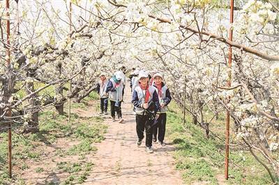 上图:在平遥梨花旅游节期间,小学生们在万亩梨园春游。