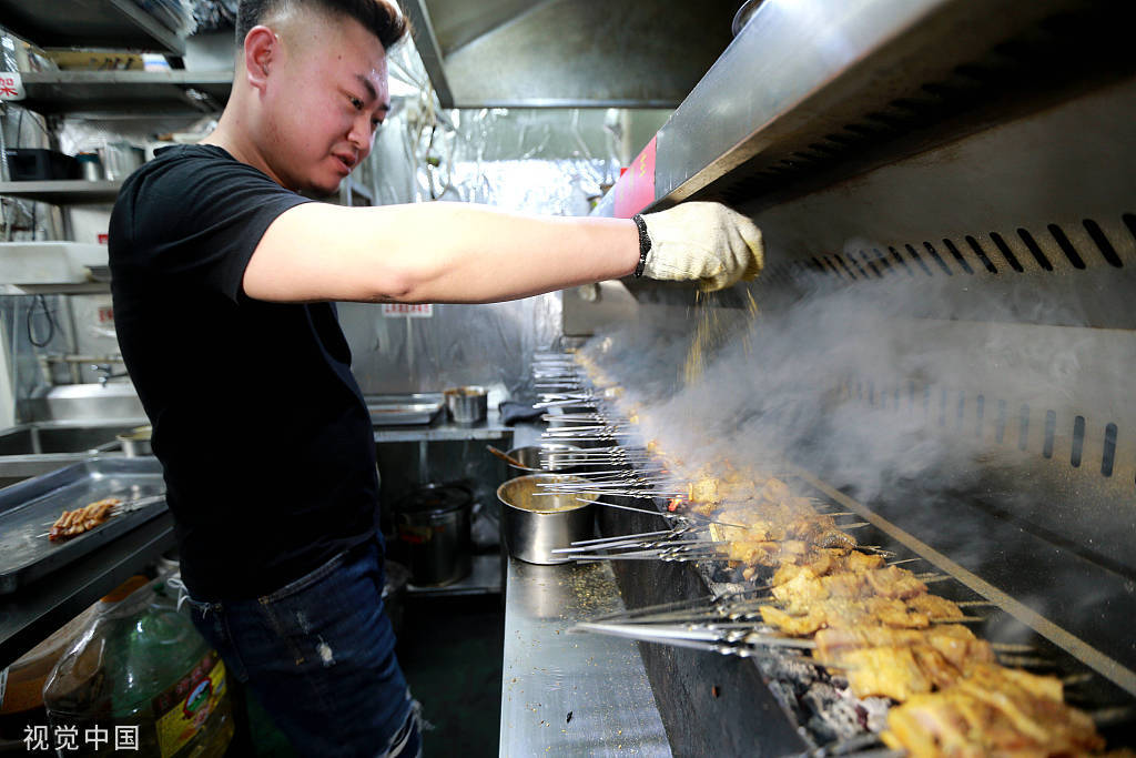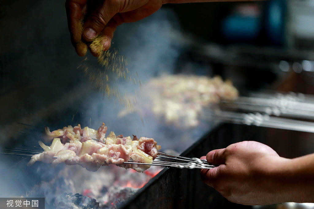 2023年3月31日,山东淄博,一家烧烤店的厨师正在烤制肉串。