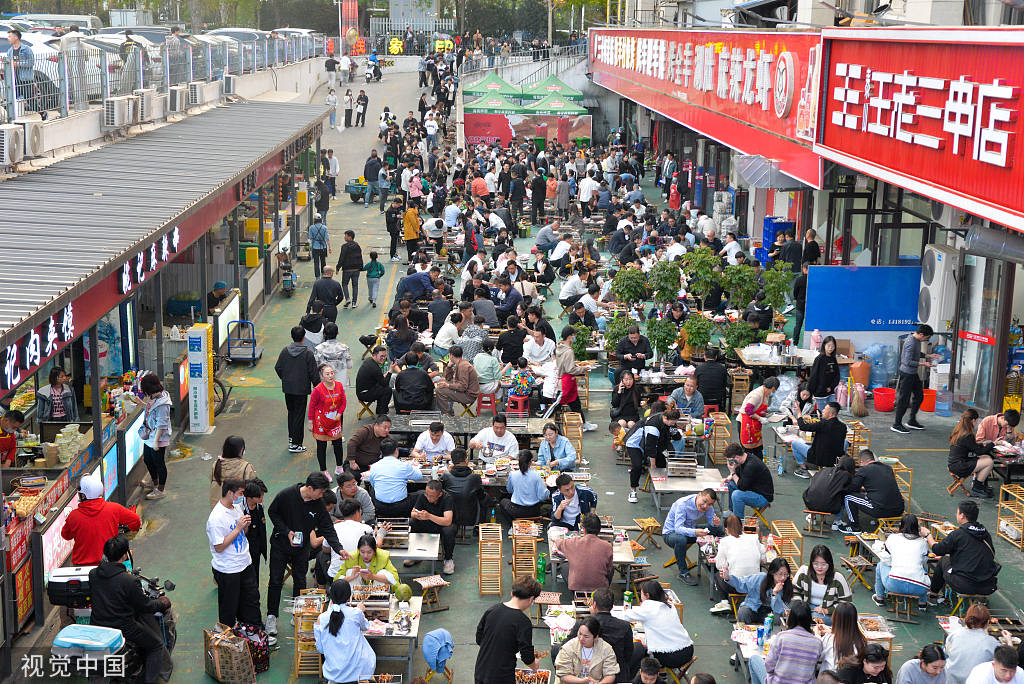 2023年3月31日,山东淄博,浅海美食园内各家烧烤店宾客满门。