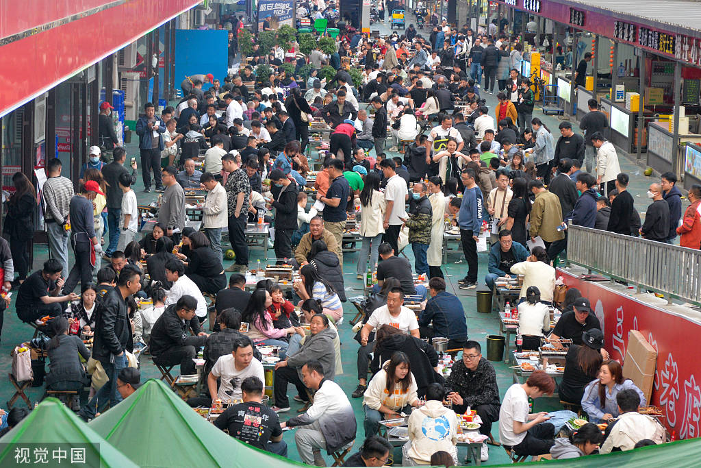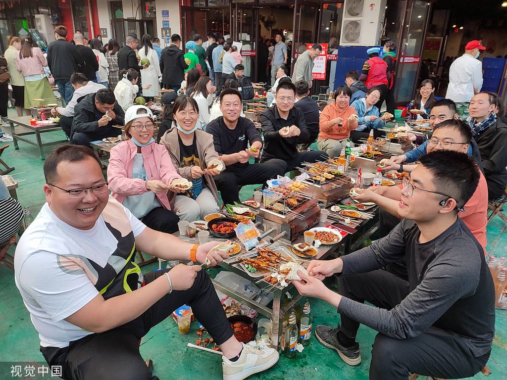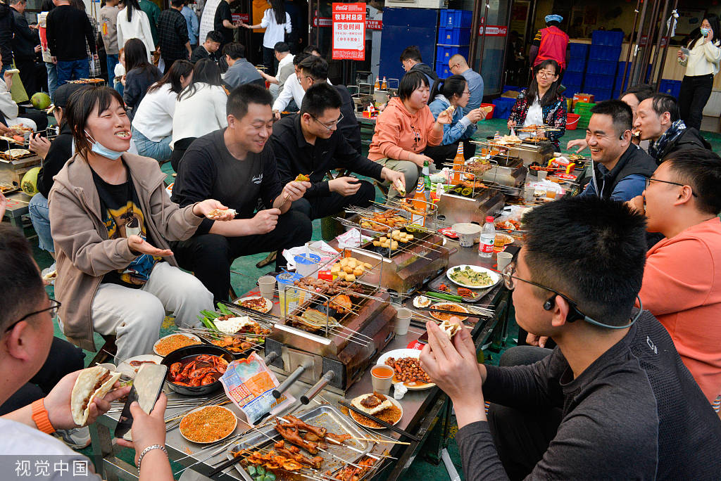 2023年3月31日,山东淄博,食客正在享用烧烤。