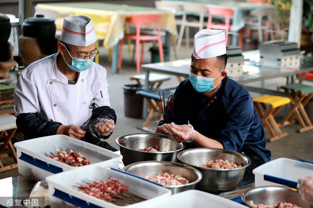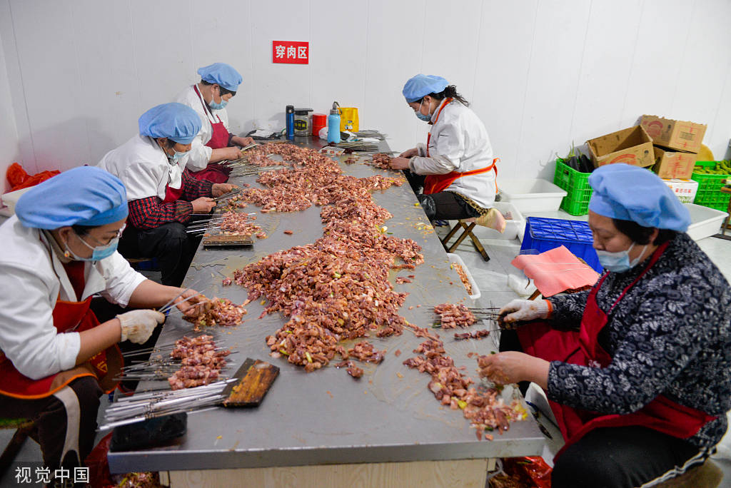 2023年3月31日,山东淄博,烧烤店后厨,串串工从上午8点到晚上8点,一刻不停才能串出2万串肉串。