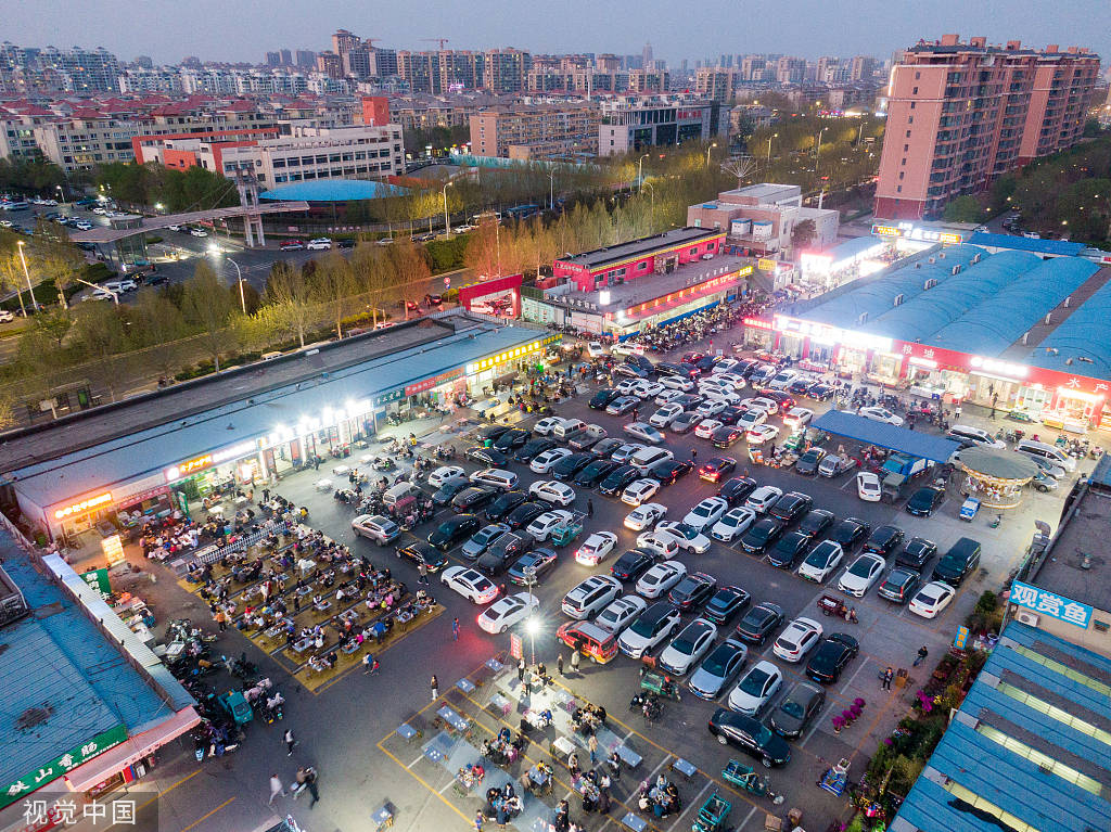 2023年3月31日,山东淄博,聚集了多家烧烤店的淄博九级便民市场内,人潮、车潮涌动。