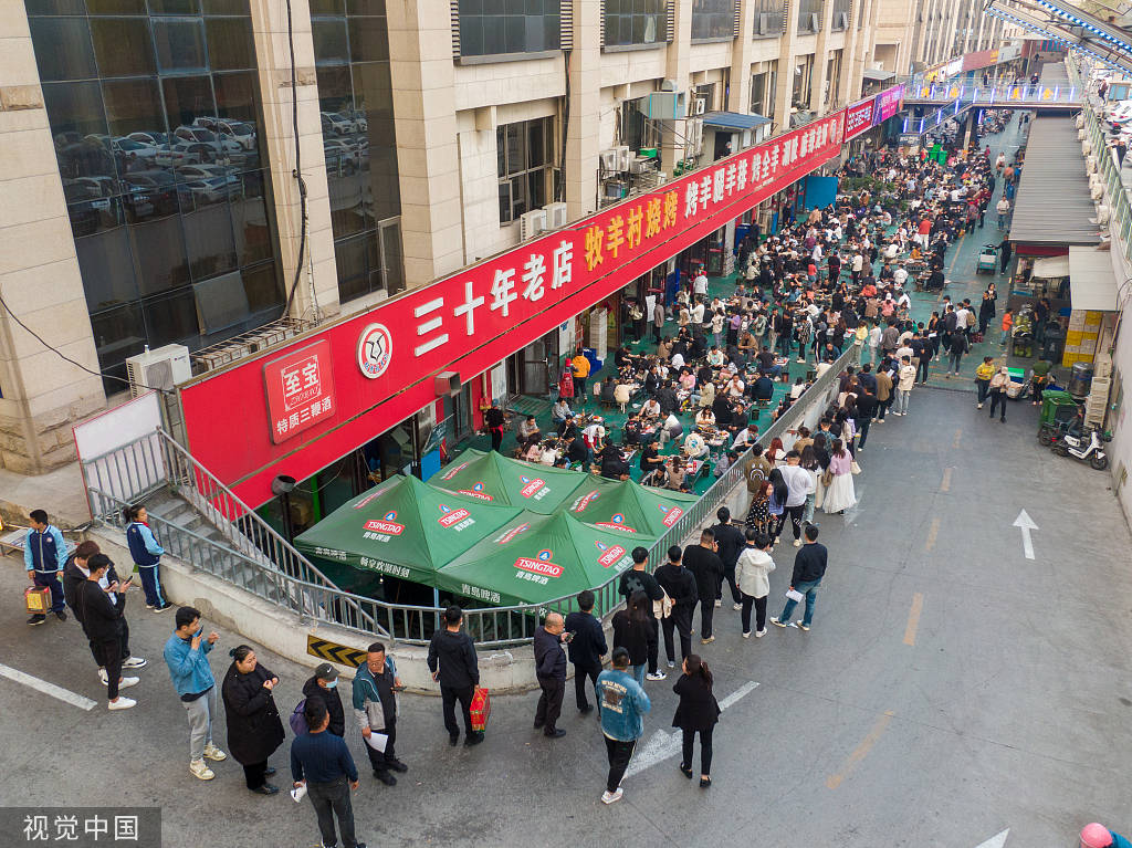 2023年3月31日,山东淄博,网红烧烤店牧羊村烧烤门前大排长龙。