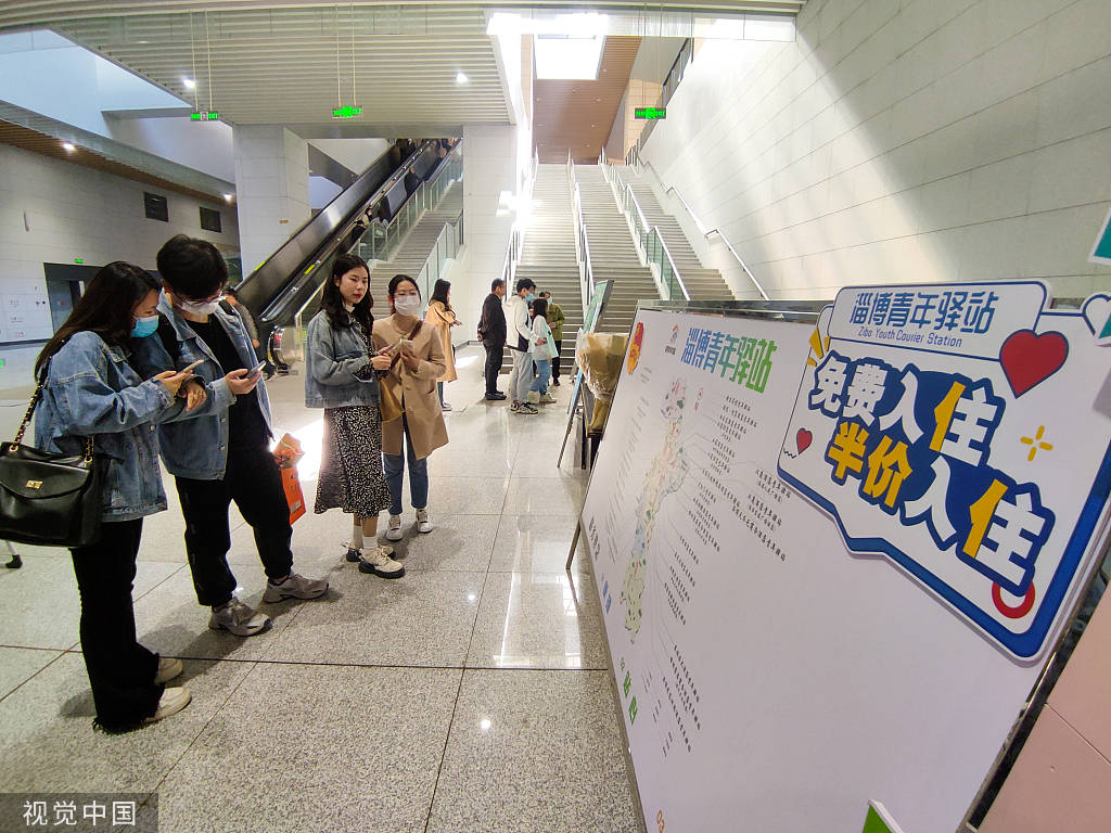 2023年4月2日,山东淄博,淄博站内,游客查看惠游政策。