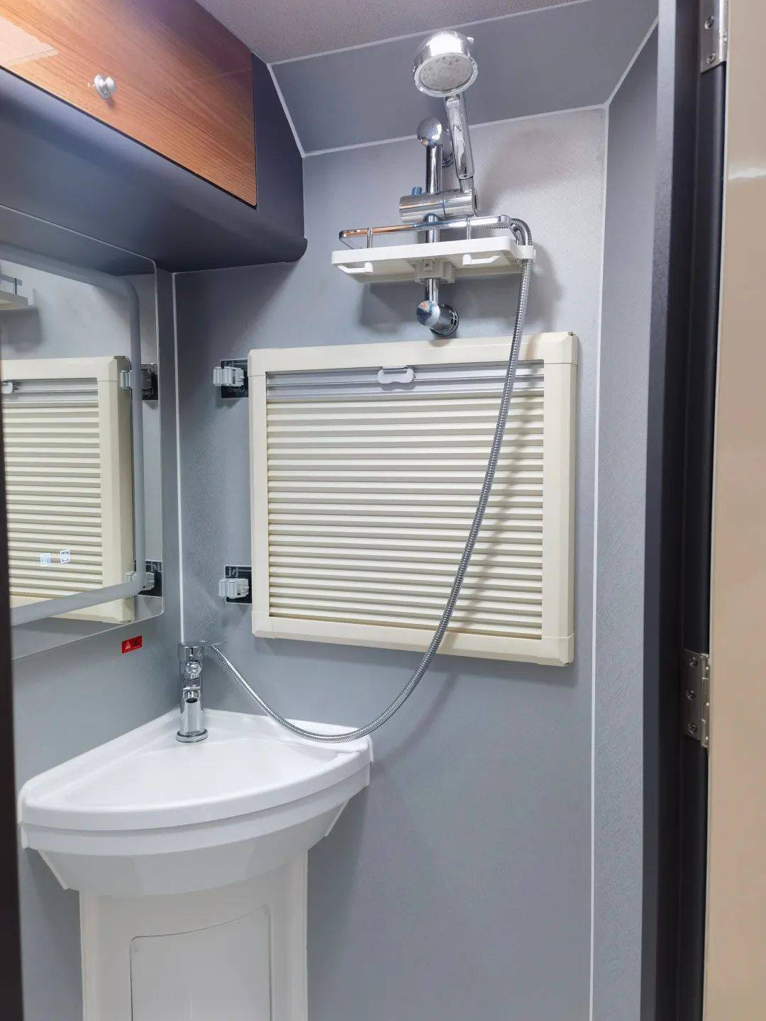 配有淋浴花洒、旋转洗脸盆