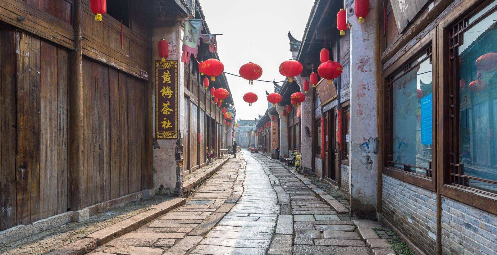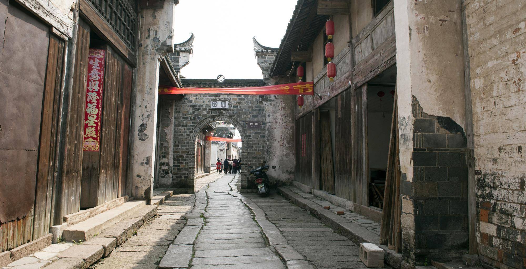街道上每块砖瓦青砖都承载着历史赋予它的故事,青石板上遗留下的痕迹是历史的沉重感,街道上没有熙熙攘攘人群。沿街的建筑,靠商业街的为店铺,商品后为坊或居民宅。房屋都是清一色的白墙青瓦,典型的徽派建筑,街道上是青石板铺成的,街中留下了独轮车留下深深的痕迹。
