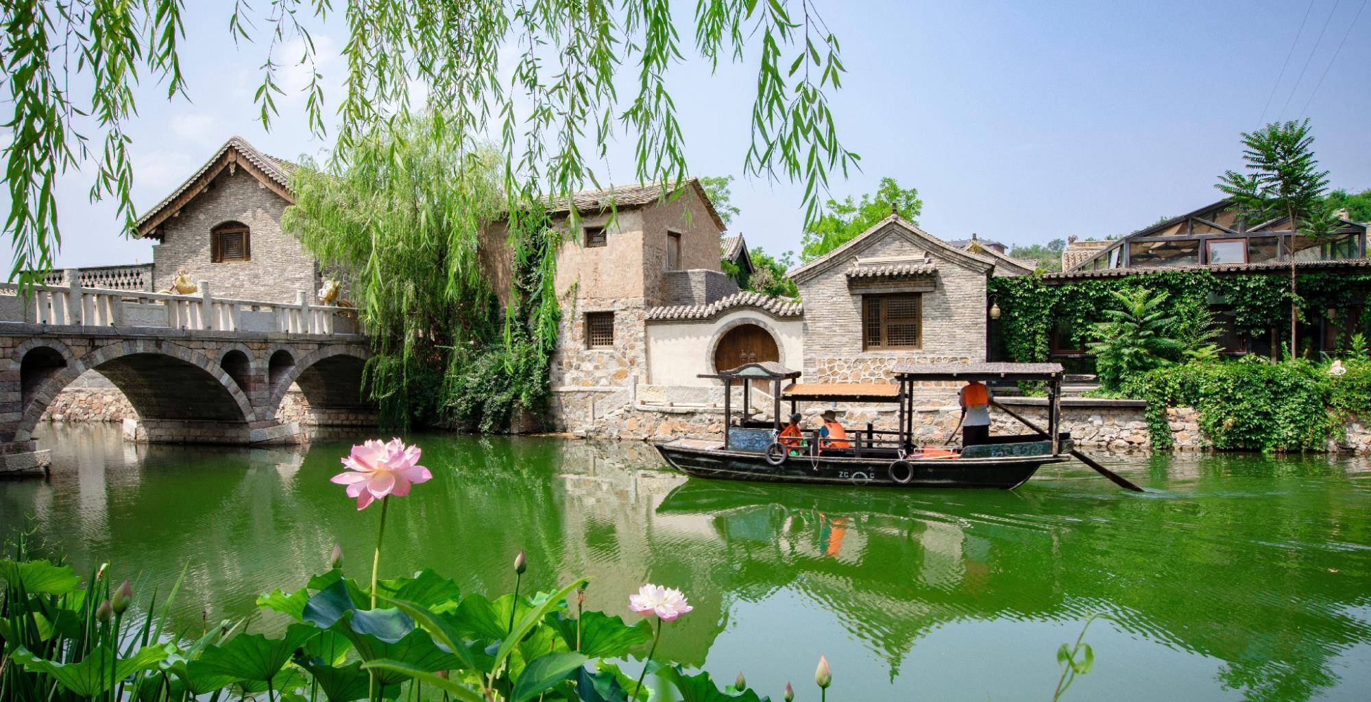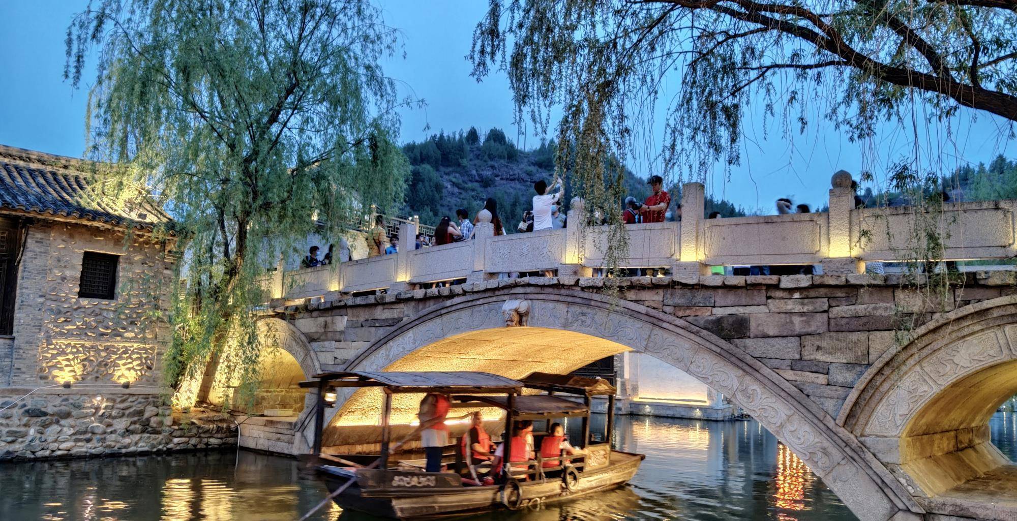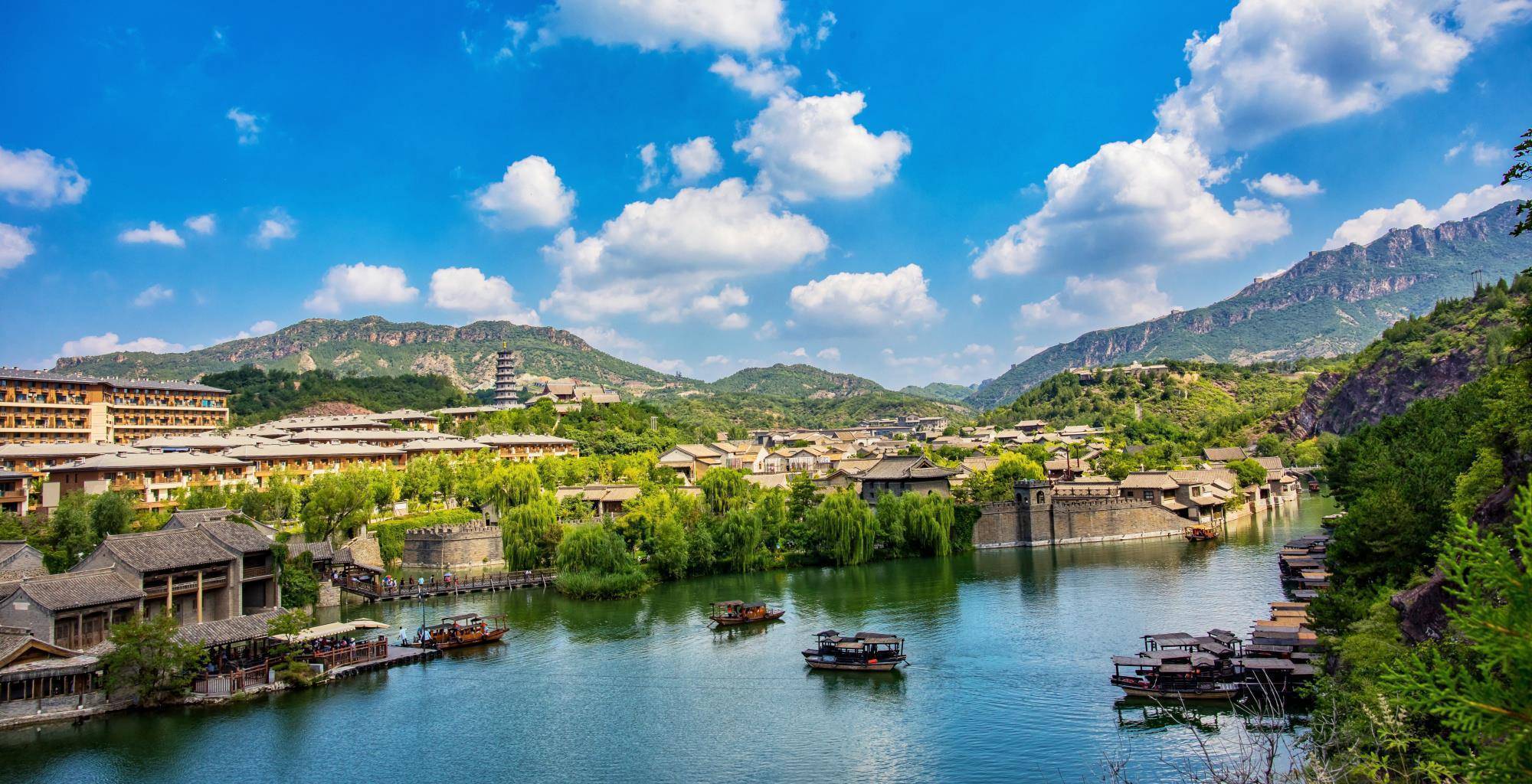 走到古街,排列两边的是古色古香的房屋,其中部分是从山西等地迁移而来的古民居建筑。因为它沿河岸而建,所以不光桥下有水,街边也有水流,还有鲤鱼鱼跃在桥下,耳边传来的是石头上晒太阳的青蛙发出的低鸣蛙叫。来到这座水镇还可以选择乘船观游,坐在船里悠闲地观赏美景格外放松。沿激流而下的泉水,发出似鞭炮般的“噼里啪啦”的声响。