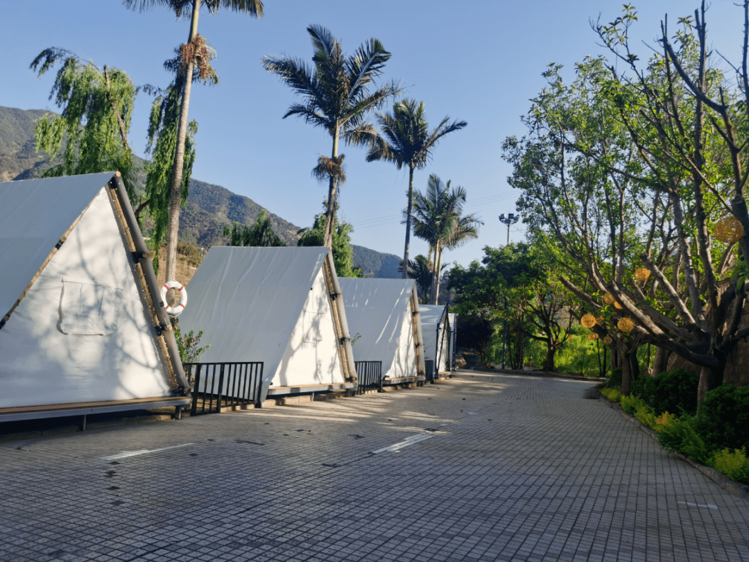 罗飞是去年进军康养旅游产业的。在政府的支持鼓励下,在朋友们的帮助下, 作为本地人的他承包了金龟岛面向库区的一段区域,邻水建起了10多座帐篷和休闲餐饮设施,今年初开始经营。在距离数公里外的省道221上,大家就能清晰看到基地中错落有致的帐篷,这也成了市内外游客到渔门、到库区必去的新打卡地。