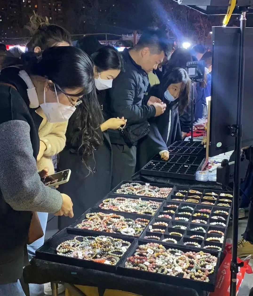 比如有摊主把确认款盲盒堆成搓堆儿的“土豆山”,任由挑挑拣拣,这景象活生生是一批年龄未满25的“捡白菜的大妈”。比如有人把音乐音量调到心惊肉跳也没卖出多少货;而琉璃手串摊主随便一北京瘫,就收钱到手软。