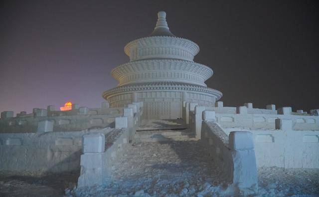 在另一面,一组高度还原天坛雪雕,寓意着瑞雪兆丰年,也是寄托了“天地风调雨顺,人和五谷丰登”的美好寓意。