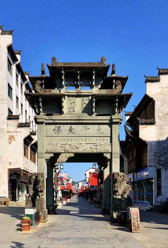 在进入朱子步行街之前,我们发现步行街入口处有一个四面牌楼。这不禁让我想起了徽州古城里的四面牌楼许国石坊。一般而言,能做到四面牌楼的,基本上都是当地出过一些大官的。徽州古城的许国石坊如此,婺源的四面牌楼也是如此。
