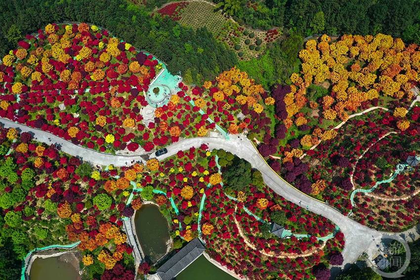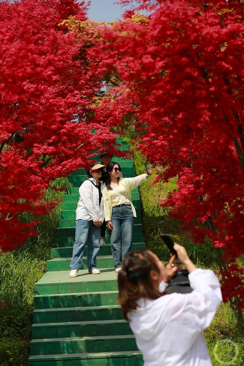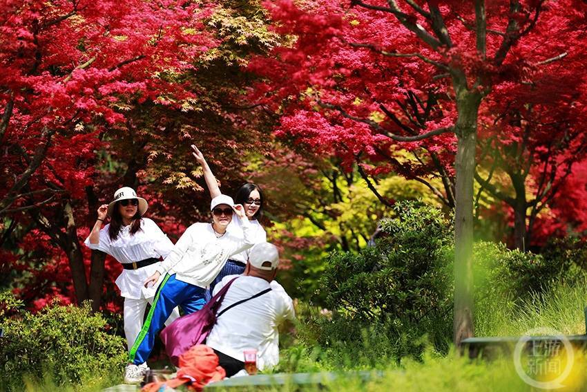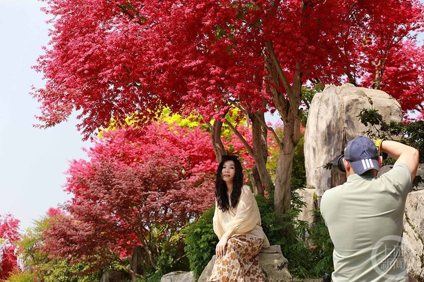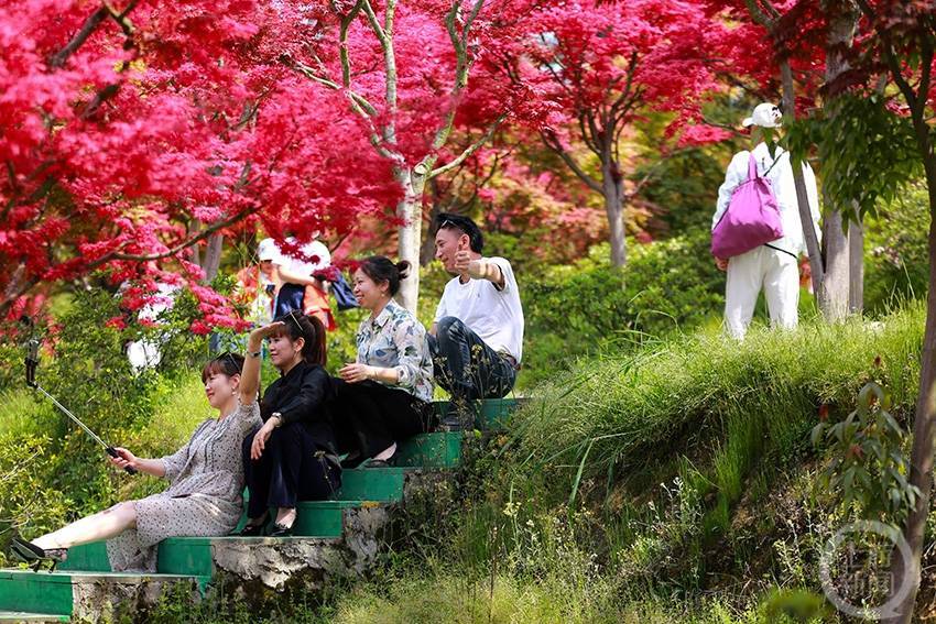 4月10日,在重庆市巴南区圣灯山镇五洲园景区内,今年新培育的锦绣枫染红了整个景区,也引来了众多市内外游客前来打卡游览。