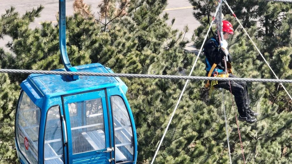 演练现场模拟索道突发故障,致1名游客滞留空中,险情发生后,值班人员立即按规定程序向景区管理中心负责人报告相关情况,景区立即启动应急救援预案,救援人员迅速到达现场展开救援行动。
