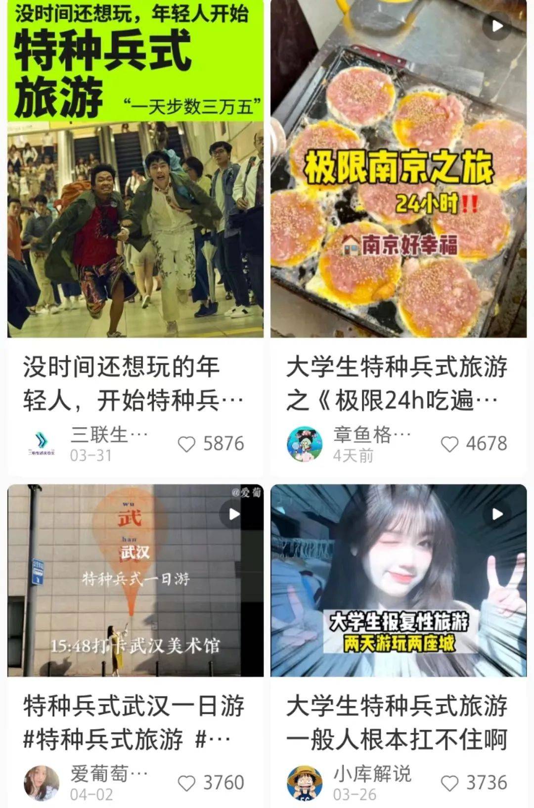 另外,也源于社交平台的助推,各类特种兵式旅游的视频走红以后,会带动一些年轻人跟风效仿,随着一轮又一轮的宣传,相关的热度不断延续,近日,去哪儿和小红书发布《五一旅行趋势报告》中,总结了2023年以来十大旅行趋势,特种兵式旅游便是其中之一,其相关话题搜索增长超240%。
