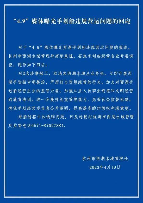 西湖景区水域管理处新闻发言人潘世安表示,对于4月9日媒体曝光西湖手划船违规营运问题的报道,杭州市西湖水域管理处高度重视,召集手划船经营企业开展调查,现作出以下回应,对三名涉事船工取消其西湖水域从业资格,立即开展西湖手划船专项整治,严厉打击违规经营的行为,加大对西湖手划船经营企业的监管力度,加强从业人员职业道德和文明经营的教育培训,进一步提升长效管理能力,完善社会监督机制,确保手划船营运信息公开透明,提高游客的知情权和满意度。乘船过程中如遇到问题,可及时拨打杭州市西湖水域管理处监督电话0571-87027884。