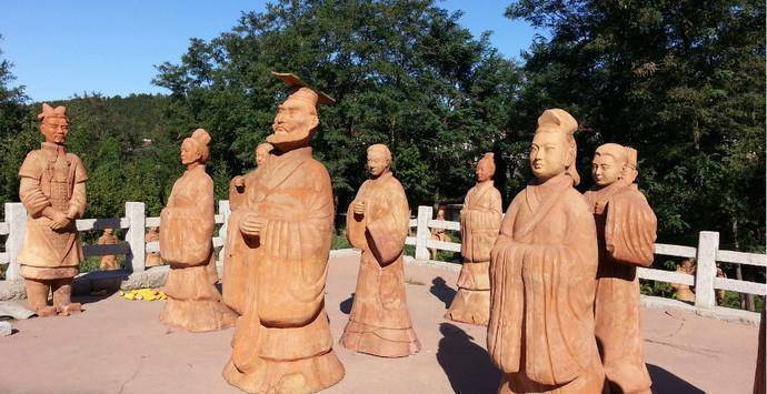 在山门前还有一对石狮子,看上去不像是古代保存下来的物品。庙前的台阶下面左右两侧还有很多石像,也是古时候的人物、服饰和造型,这个应该最近几年新建的。穿过山门之后,就到了第二进院落了。
