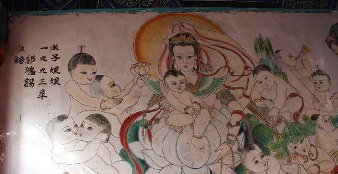 在正殿殿左右两侧则是分别供奉着送子娘娘、王母娘娘。在大殿于与寺庙的第四进院落之间还有两个封闭式的走廊,东西各两个,走廊内悬挂着无数船只,小的只有几尺的长度,大的的3米多长。除此之外,走廊内还供奉着十帝阎君,墙上还有一些诗句,都是以前的文人墨客游览时所留下的。