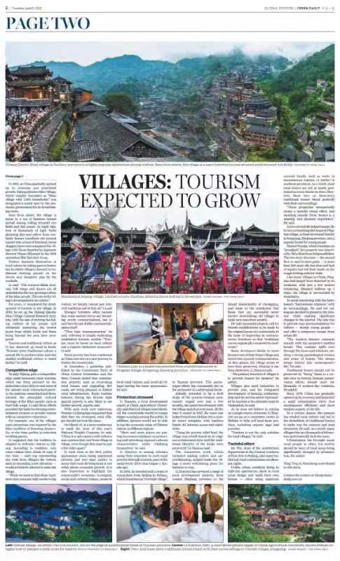 4月11日,《中国日报》旗舰版、香港版,国际版、亚洲版头版转2版整版配图刊发Rural areas taste commercial success(多元化乡村振兴重塑乡村价值)。关注贵州西江千户苗寨依托独特的苗族文化习俗打造文化体验式旅游新业态。具体报道如下: