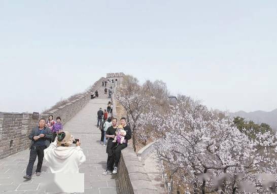 抵达景区入口,人群中随着春风飘扬的各类导游旗分外显眼,停车场停满了旅游大巴车。登上南四楼,长城蜿蜒曲折绵绵不绝,漫山遍野的春花已经盛开,许多游客都掏出手机拍照,留下这值得纪念的一刻。到了午间,长城球幕影院场场爆满,绝大多数都是带着孩子的游客。