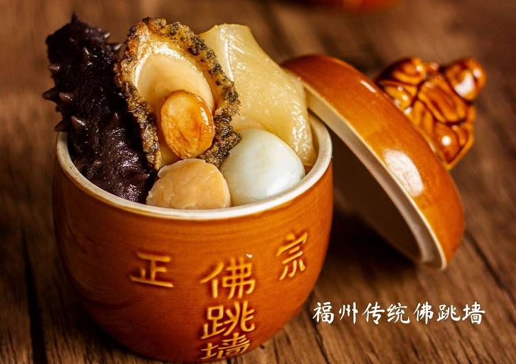 佛跳墙又名福寿全,是福建省福州市的一道特色名菜。集几十种原料煨于一坛,各料互为渗透,味中有味。食时与各种香气混合,香飘四座,烂而不腐,滋味无穷。吃起来软嫩柔润,浓郁荤香,荤而不腻。