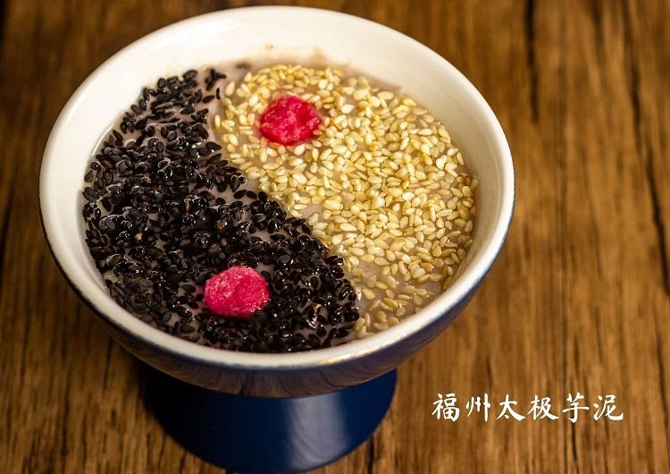 福州人喜食甜食,筵席上更是无甜品不欢,福州太极芋泥便是不可或缺的一道特色传统美点。厨师遵循古早手法,亲手熬制猪油,成品上撒黑白芝麻及梅舌等福州传统甜点以增香。芋泥细腻润滑,香甜可口,是宴后解腻之佳品。