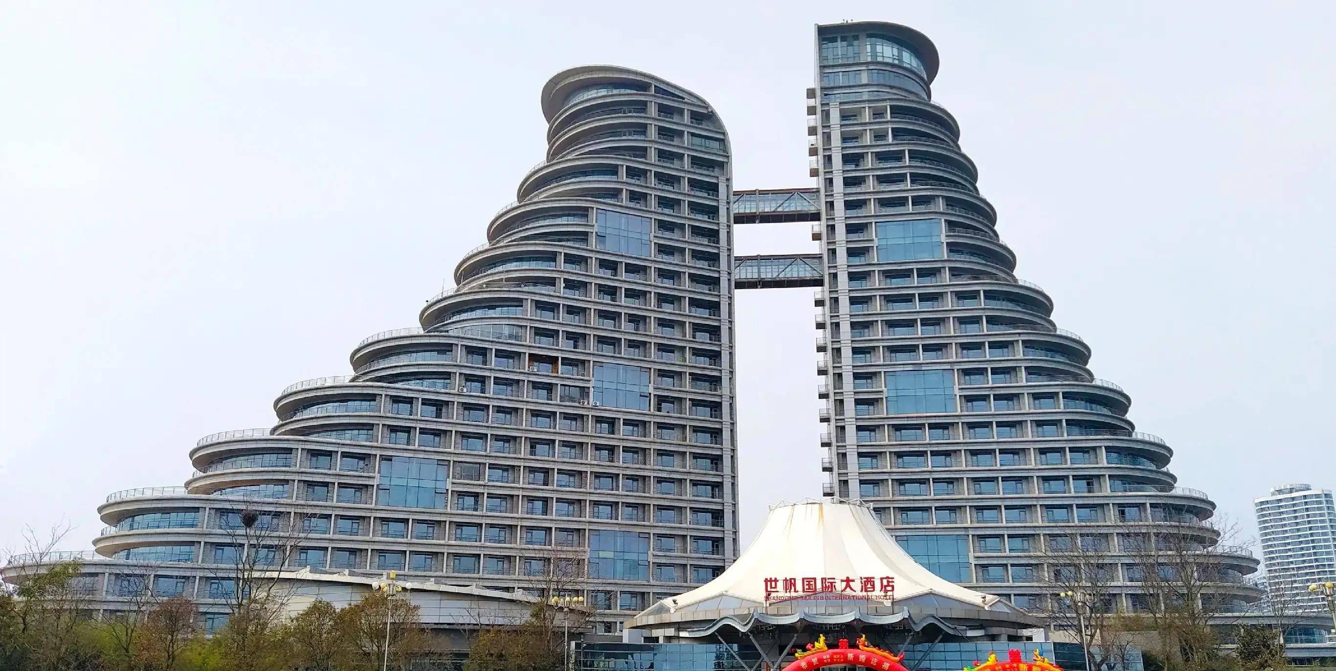 在世帆赛基地岸边的世帆国际大酒店,造型很别致,如两艘帆船。