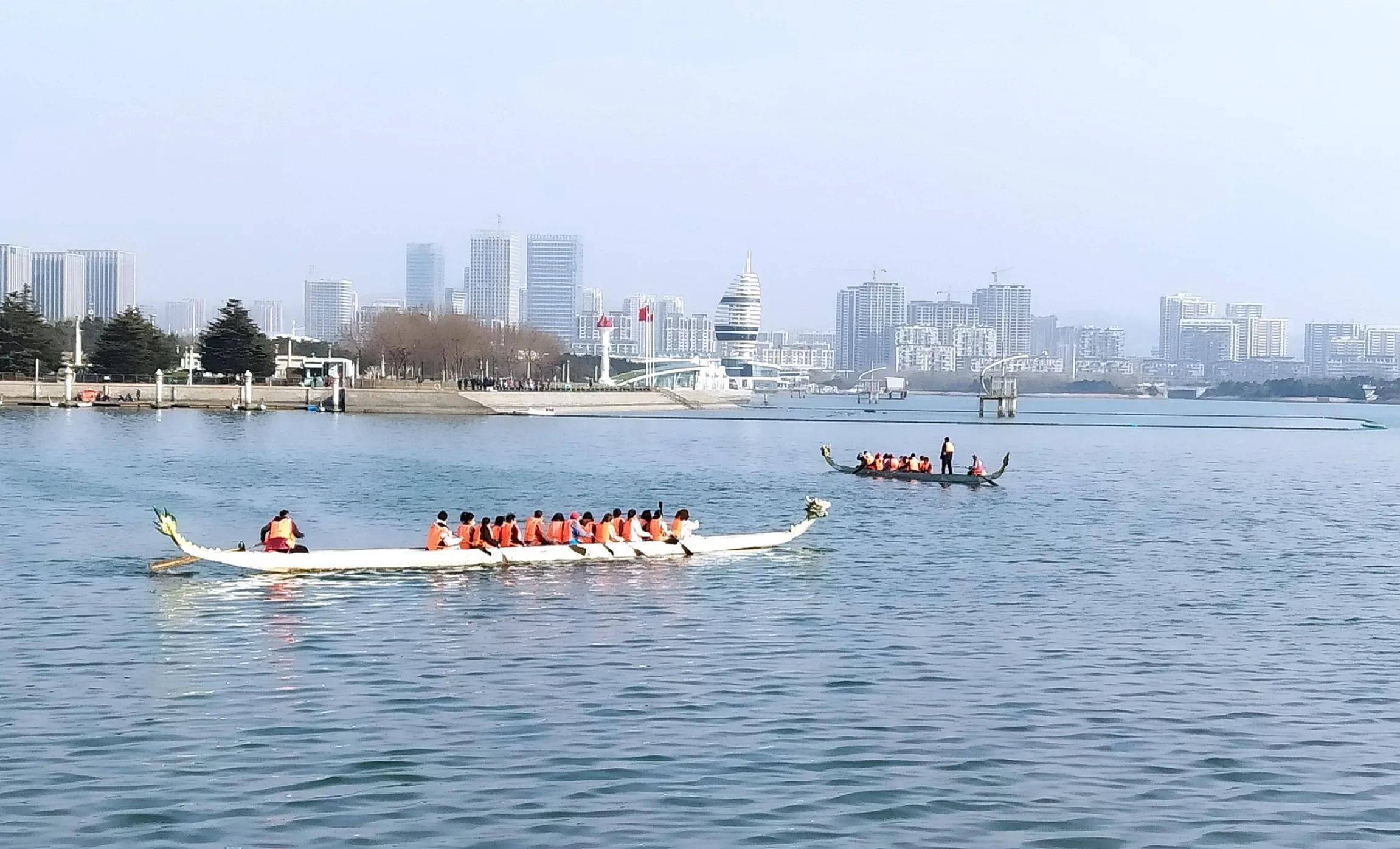 在骑到一处探到湖里的观景台处,正好遇到了我的队友们在划龙舟。