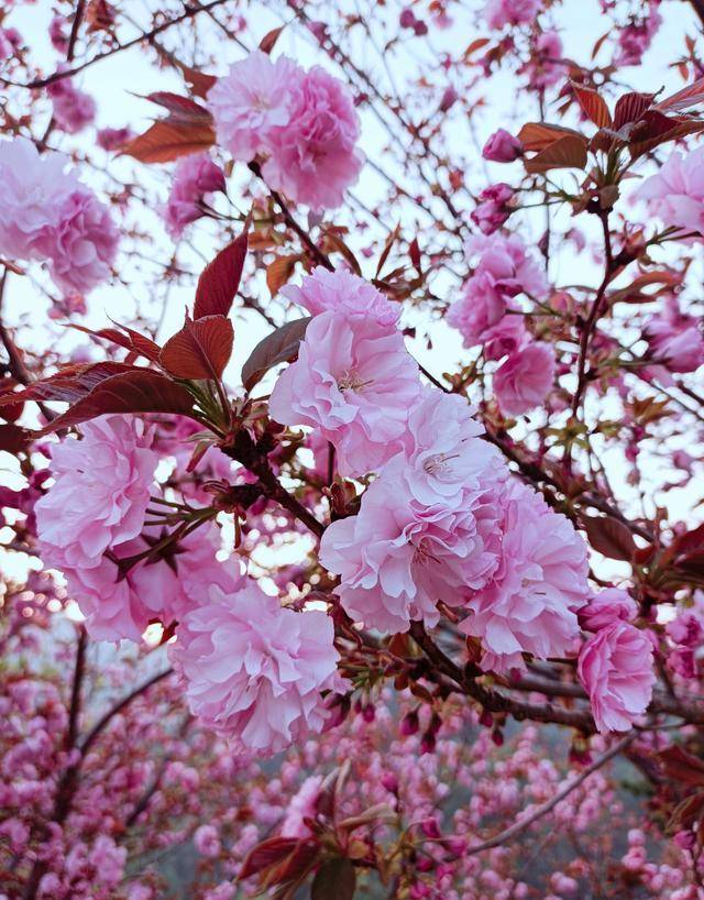 不过不要遗憾,颜色更浓艳的晚樱盛开了。不同于樱花的浅粉,晚樱介于玫红和粉红之间,如果说樱花是清丽的少女,那么晚樱就是妥妥的风韵少妇了。