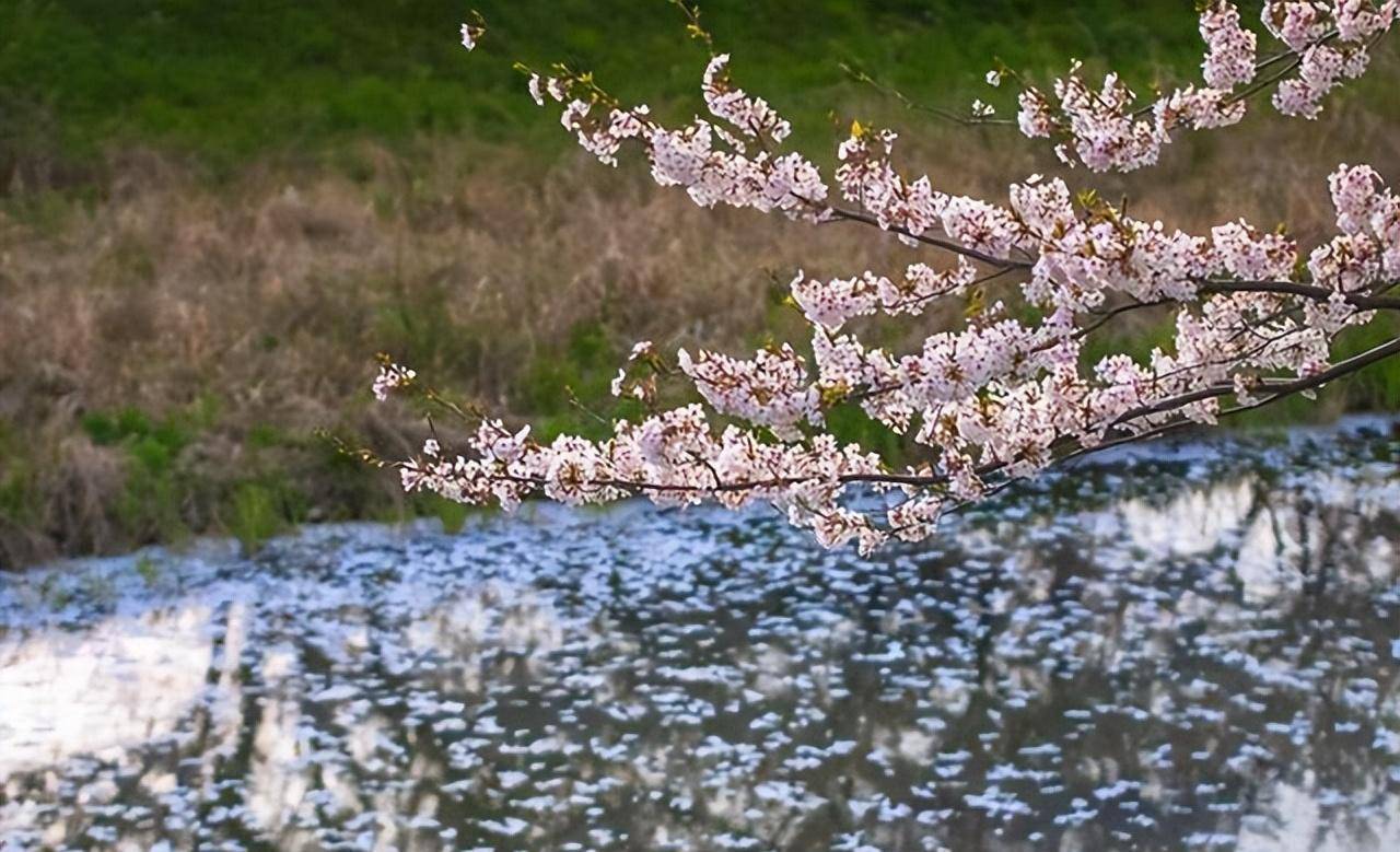 这个时节,樱花已经谢了,湖面飘满了粉色花瓣。