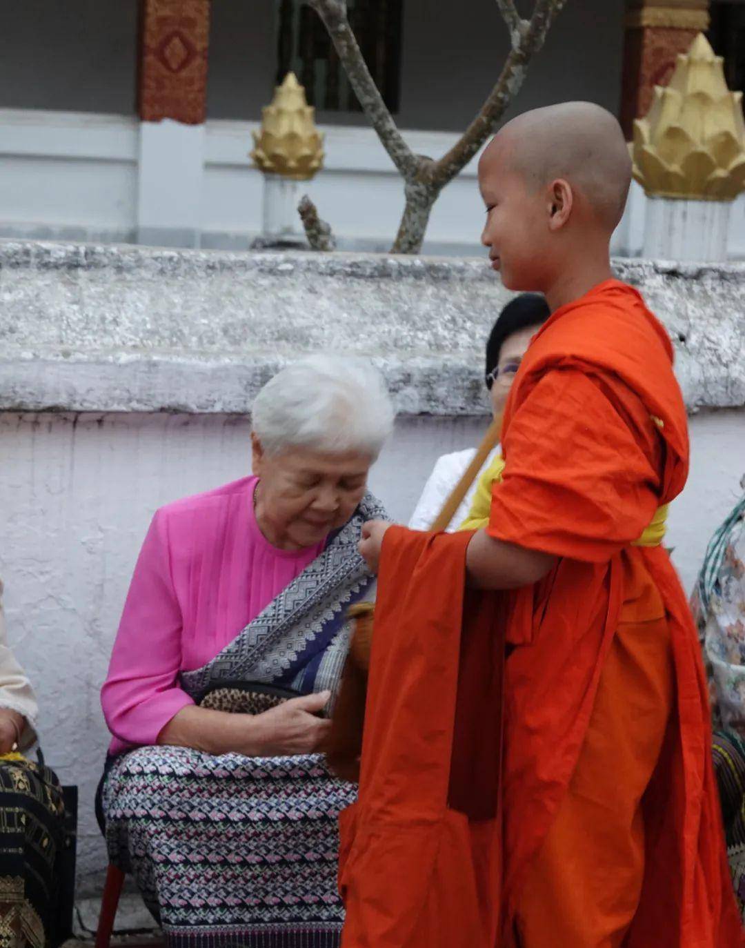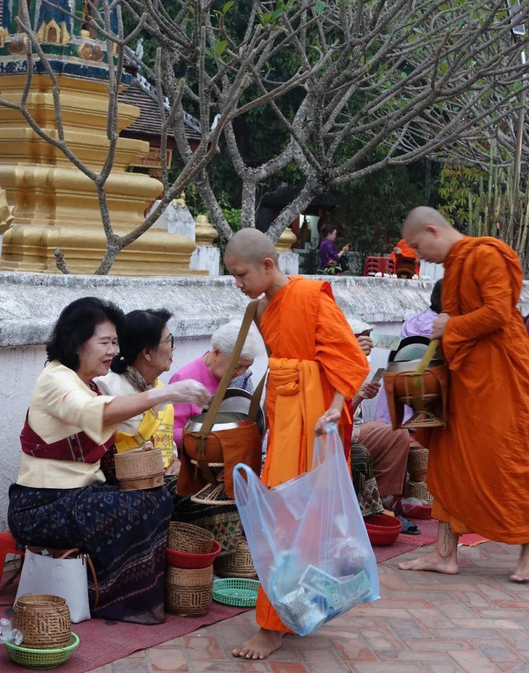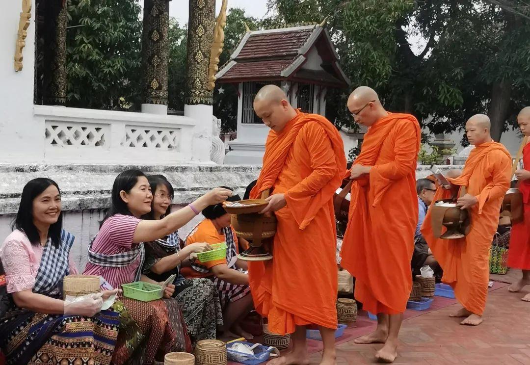 布施者把糯米饭、水果、饼干等食物用右手(左手被认为亵渎神灵)直接放进饭钵,不可碰触僧人