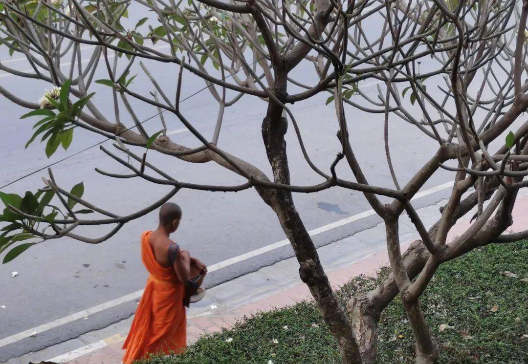 这个早晨,在盛开的鸡蛋花树下,橙袍的僧人赤足走过每一个街巷