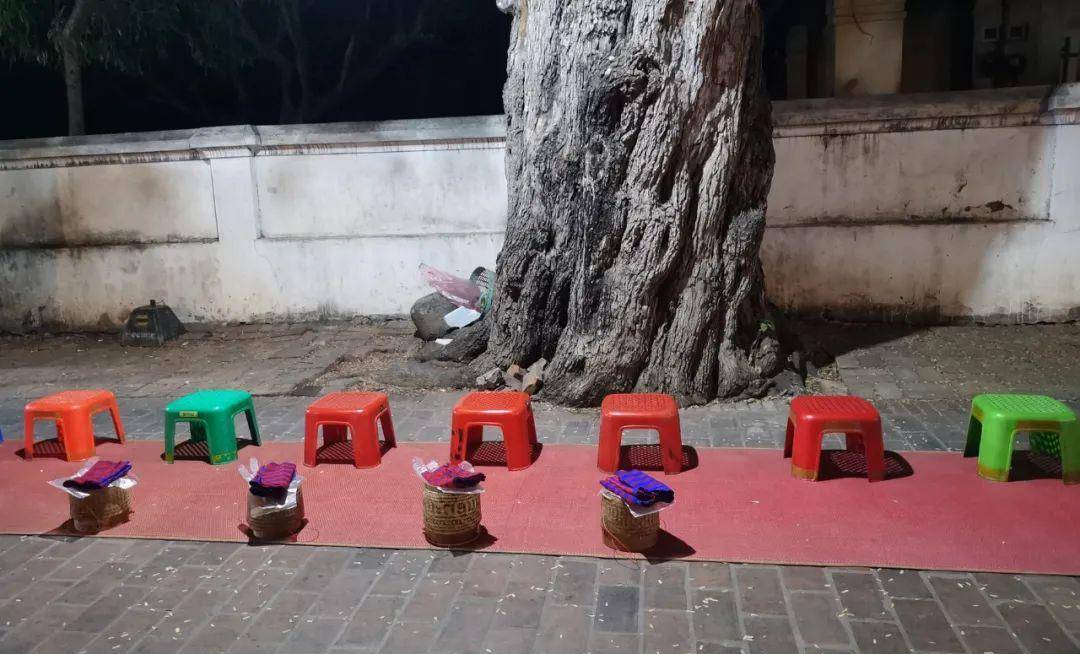 当地居民布施是半跪在薄毡上的,这些小凳子是卖糯米饭的小贩给不习惯跪坐的游客、旅行团准备的