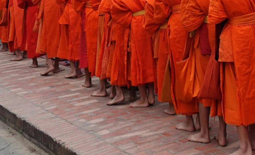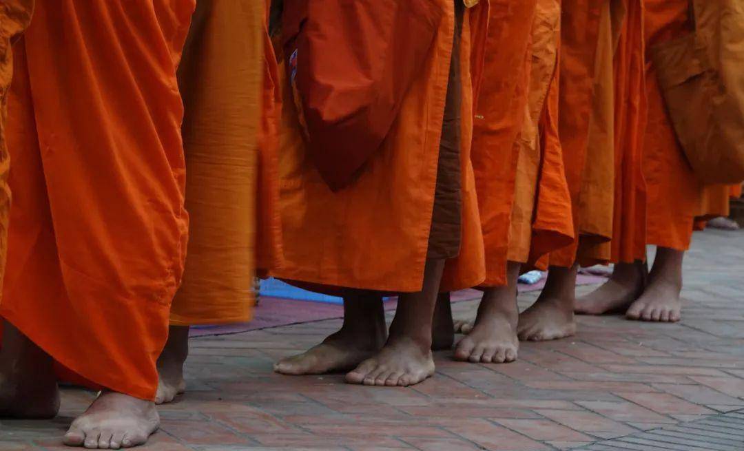 赤足的僧人们排成一列走向布施者,布施者将一小撮一小撮饭团依次放进每个僧人的钵盆里