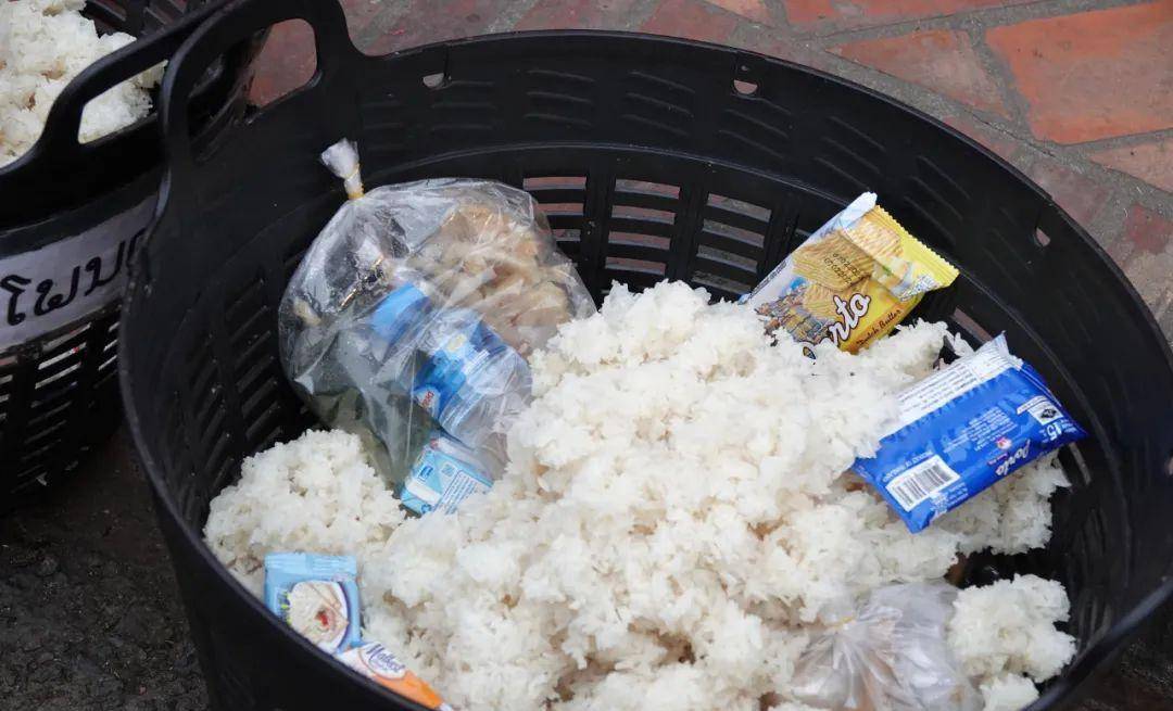 佛教有过午不食的戒律,如果钵里的餐食过多、超过了午饭的量,他们会把收到的钱和多的米团放入街边的筐中或者路边小孩撑开的布袋里,这些小孩一般都是贫苦人家的孩子