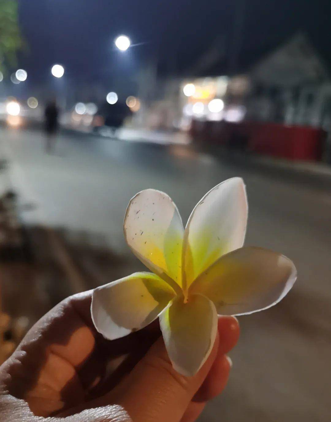 天还没亮,地上散落着几朵鸡蛋花,鸡蛋花是老挝的国花,鸡蛋花树被当作行道树种满了街道两旁