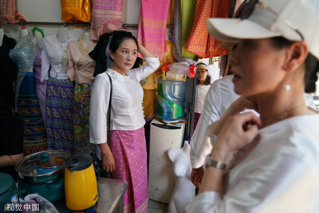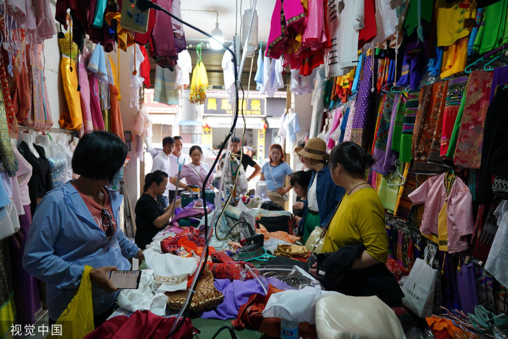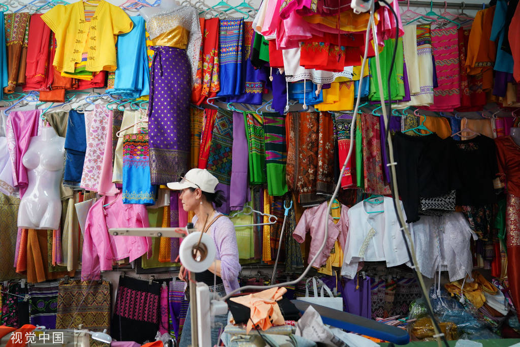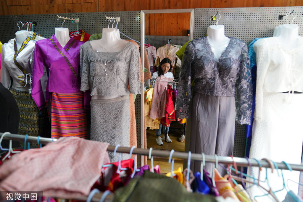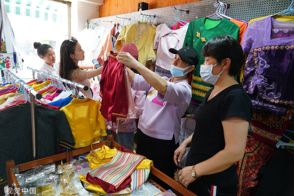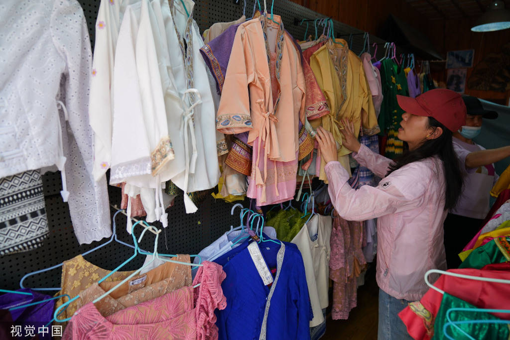 4月10日,云南德宏,芒市服装店内,游客挑选心仪的服装。随着泼水节临近,傣族服装掀起了销售热潮。中新社记者 刘冉阳 摄
