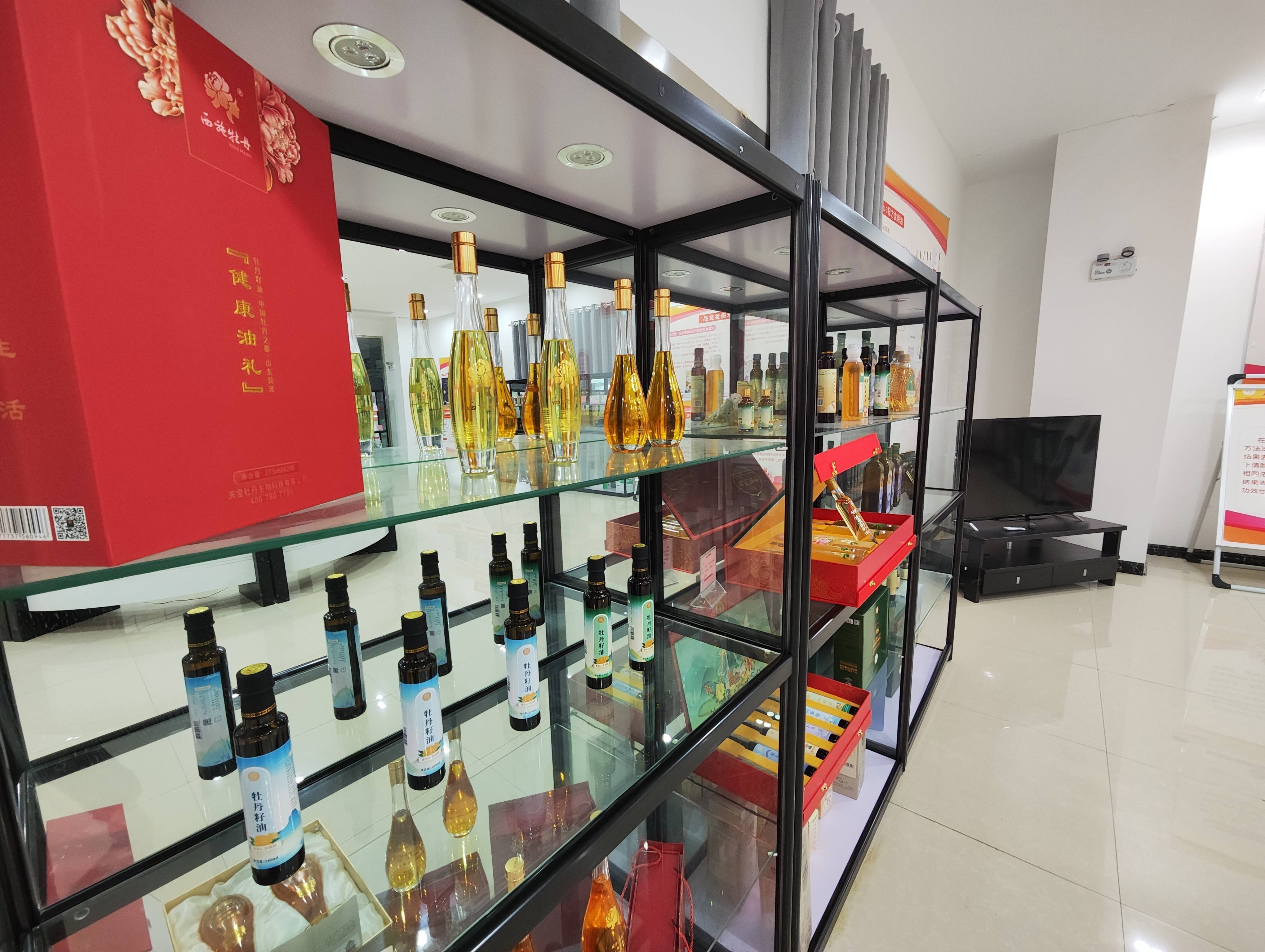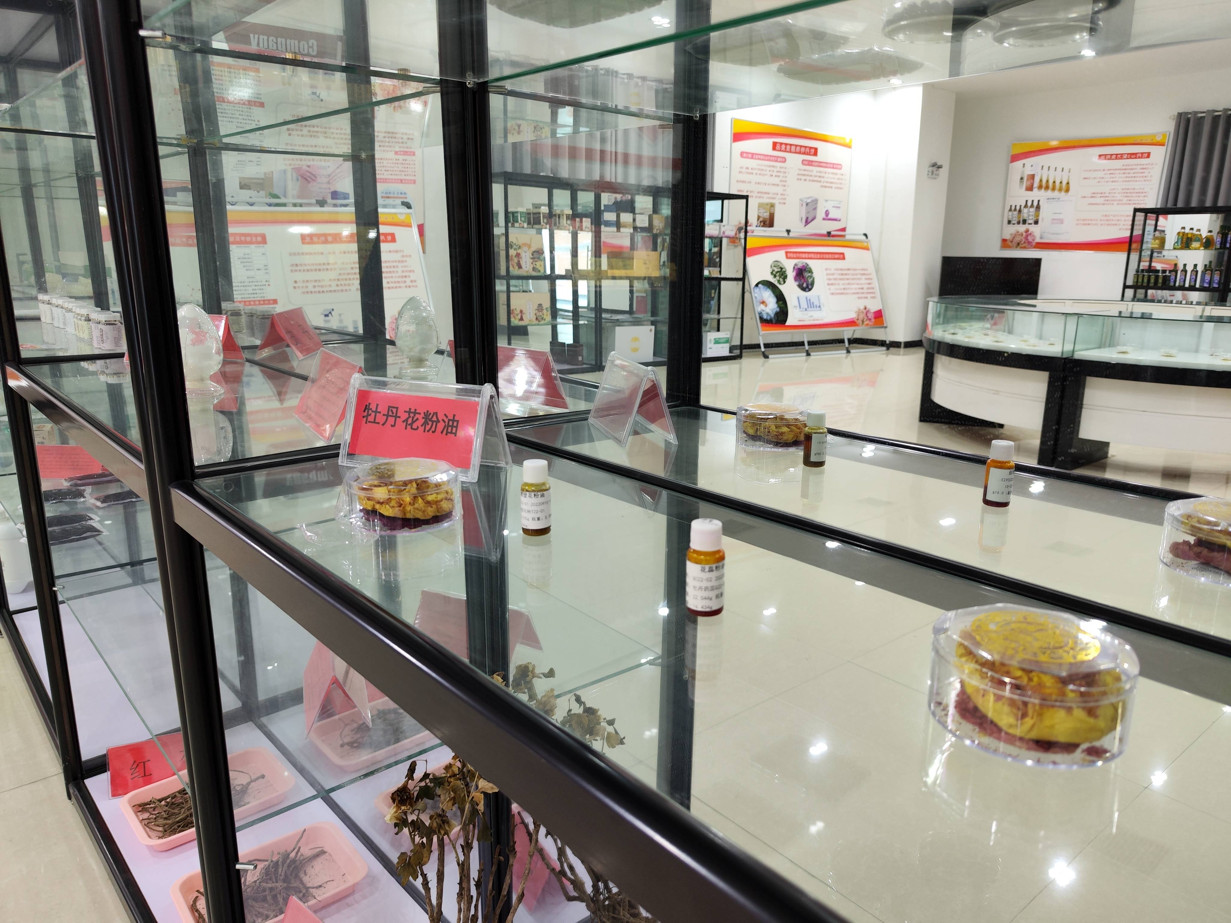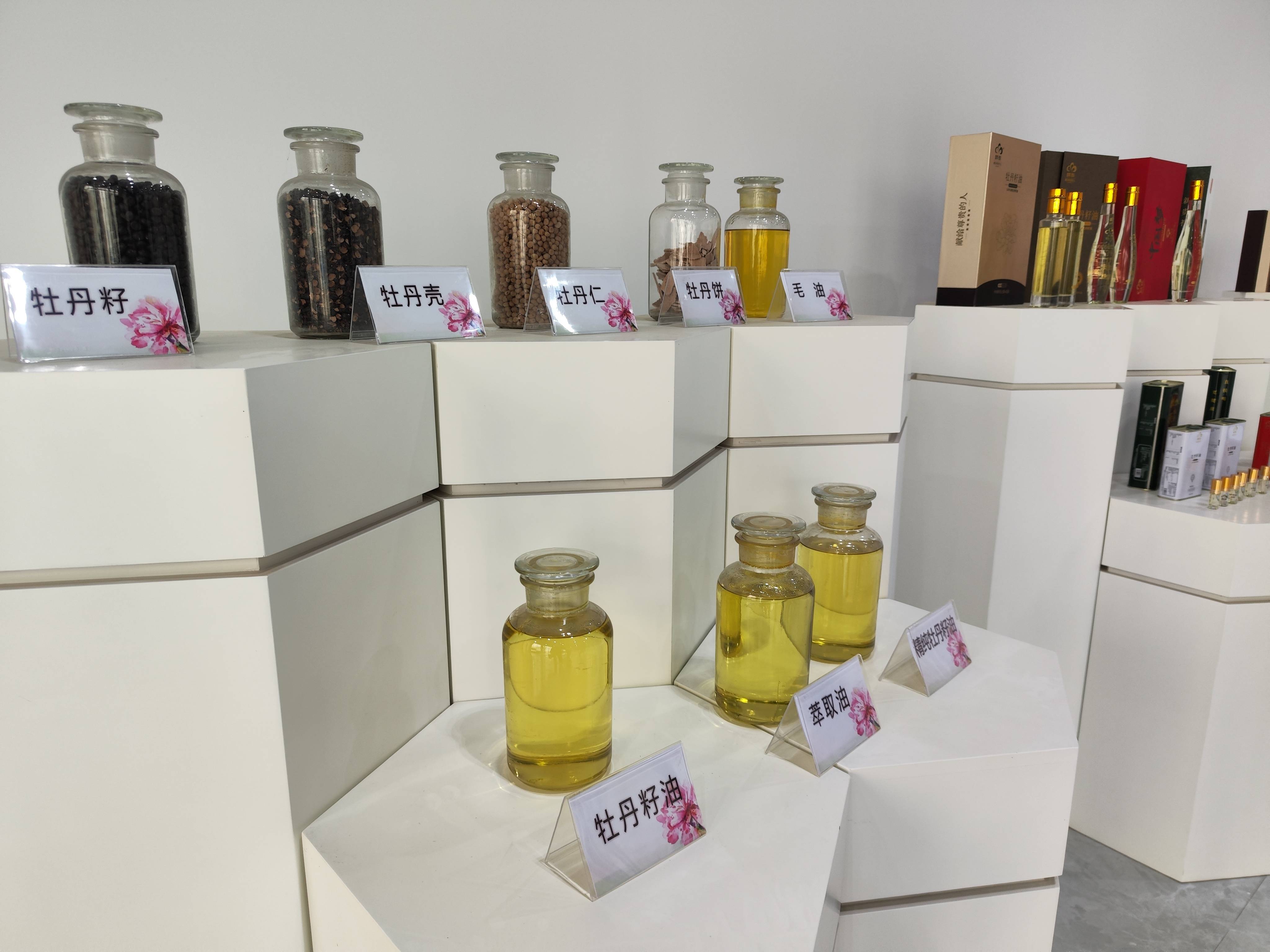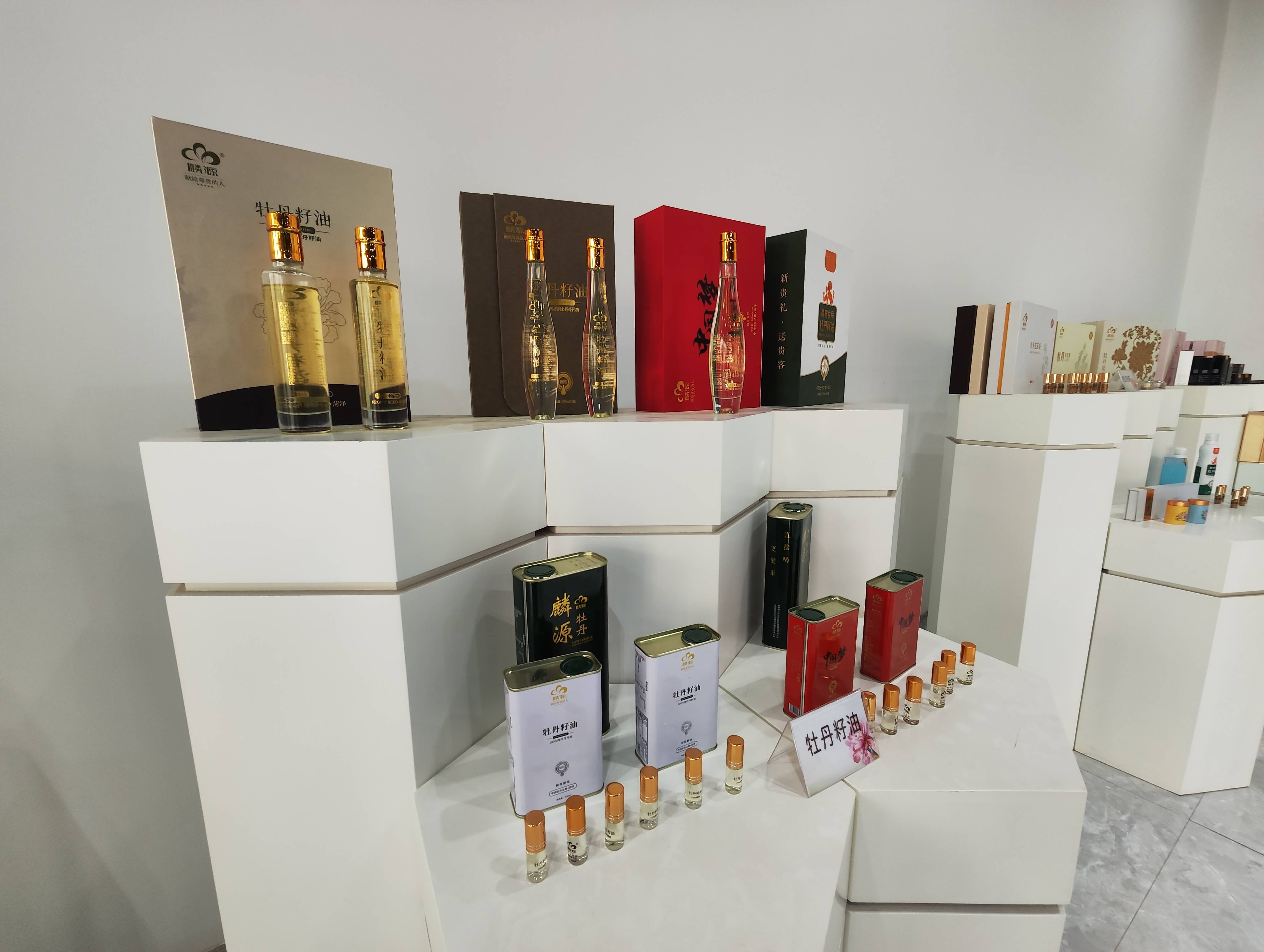 同样在菏泽市康普生物科技有限公司展厅内,各种各样以牡丹为原料的产品让人眼花缭乱。尤其是该企业不断加强科技创新,对牡丹籽油进行精细加工,研究开发出科技含量更高、更时尚、更实用的牡丹籽油产品。