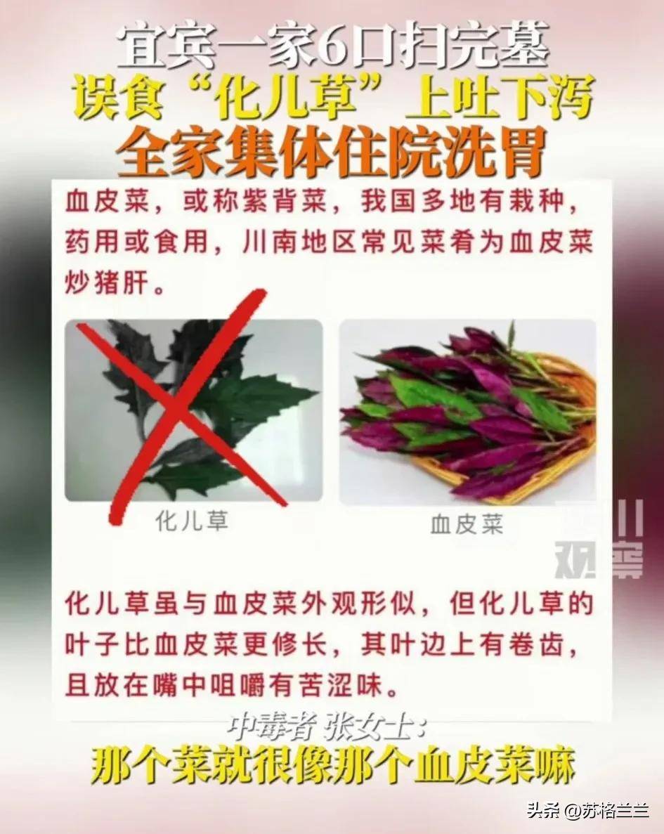 3月2日,当地疾控也来给她们进行了科普,才知道他们误把化儿草误当成了血皮菜,血皮菜可以食用,但化儿草只能外敷,可以消肿,但不能内服。
