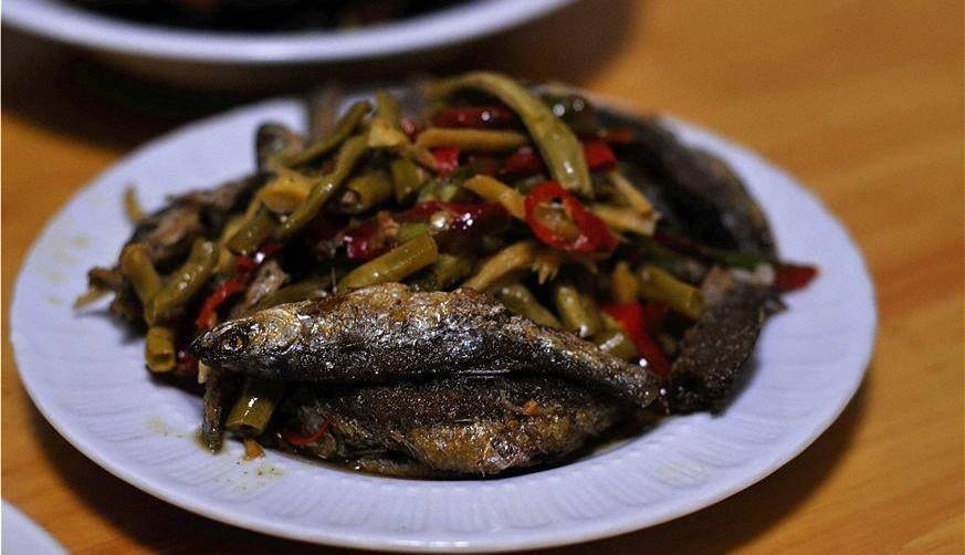 酸豆角炒火焙鱼,火焙鱼是 妈妈亲自从老家的河里笼上来的,然后亲手用小火焙干,加上自己做的酸豆角焖熟,超级下饭呢。